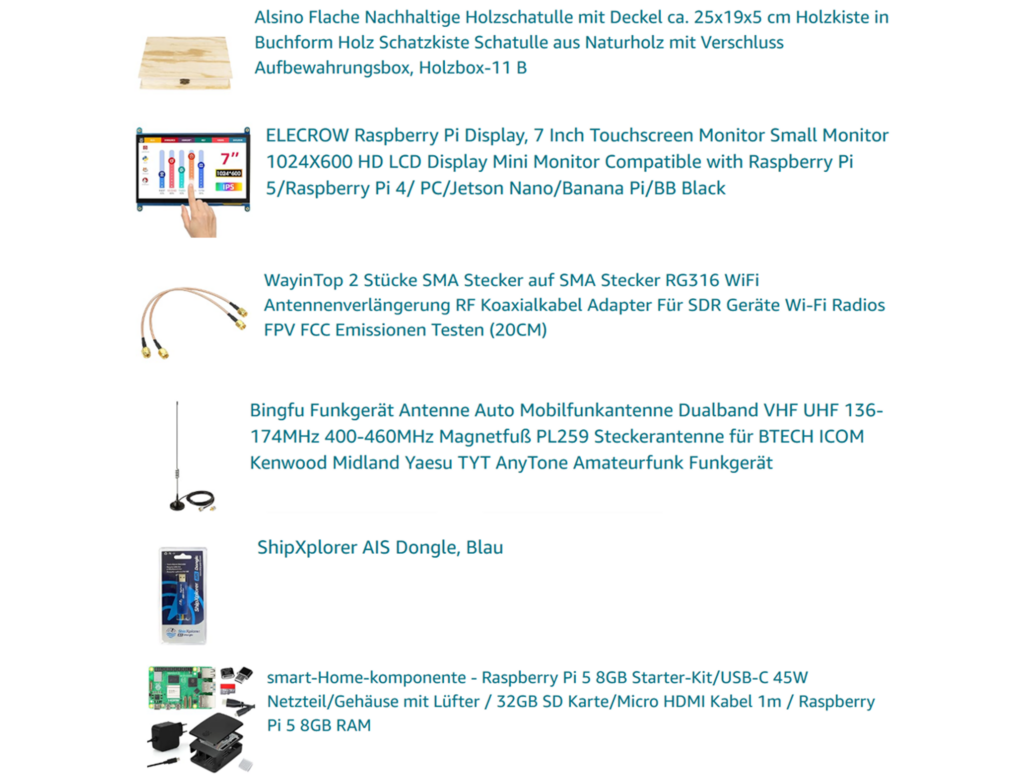 Für den Bau des Empfängers hatte ich mir untenstehende Teile bestellt und in handwerklicher Kunst zu einem Ganzen zusammengesetzt. Beim Raspberry Pi entschied ich mich für das 5er Modell, weil dieser schon mit einem Dualband-WLAN bestückt ist. Mit dem Raspberry Pi Imager war die Installation eines Betriebssystems auf dem Raspberry per SD-Karte sehr einfach. Eine ausgediente Funk-Maus sowie ein Funk-Keyboard aus den Privatbeständen vervollständigten das Setup. Damit waren dann auch schon alle vier verfügbaren USB-Anschlüsse belegt: Maus, Keyboard, Strom für den Bildschirm und der AIS-Dongle.